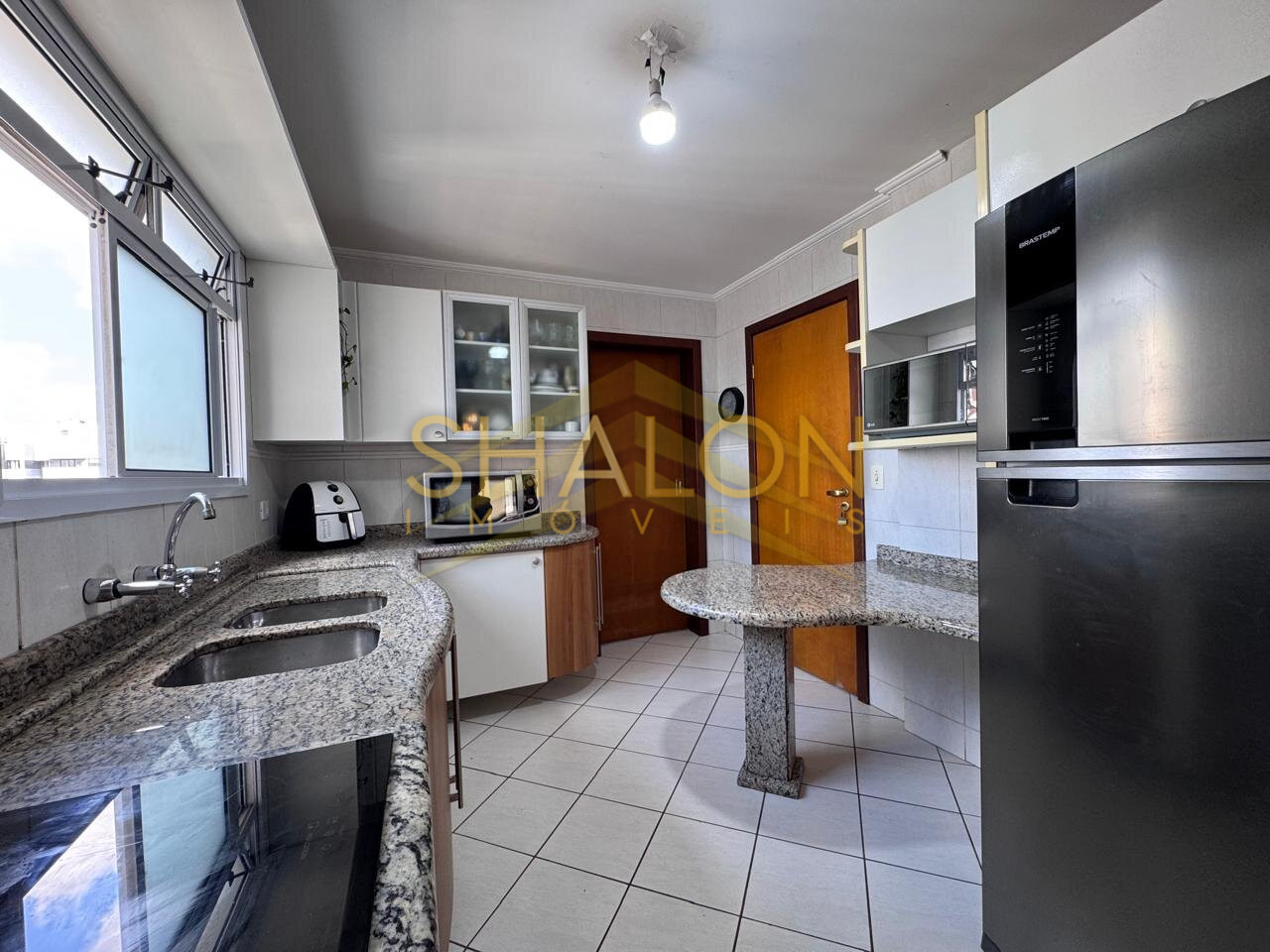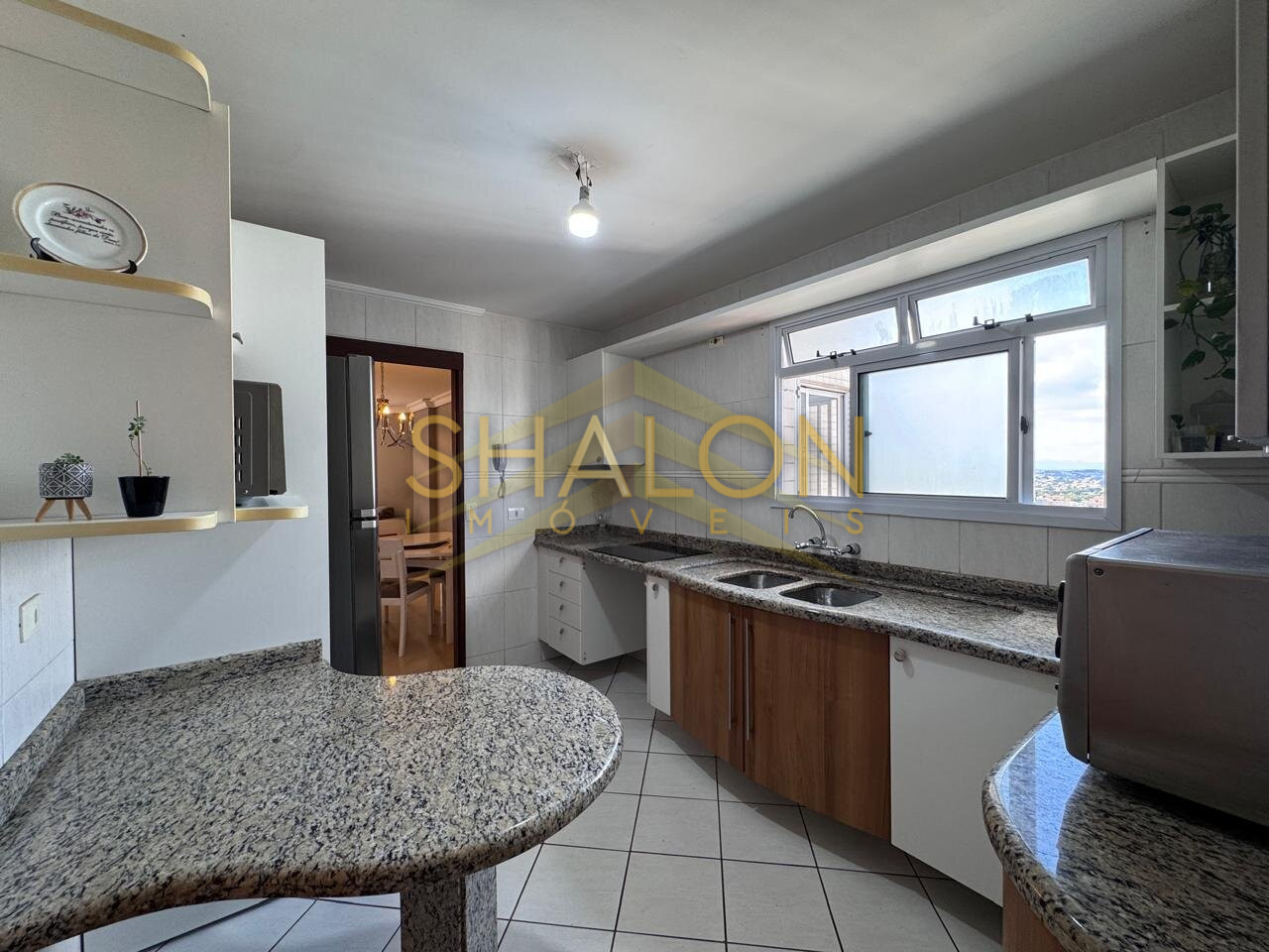 A cozinha possui ótima iluminação natural e uma vista encantadora, tornando o ambiente ainda mais agradável no dia a dia.