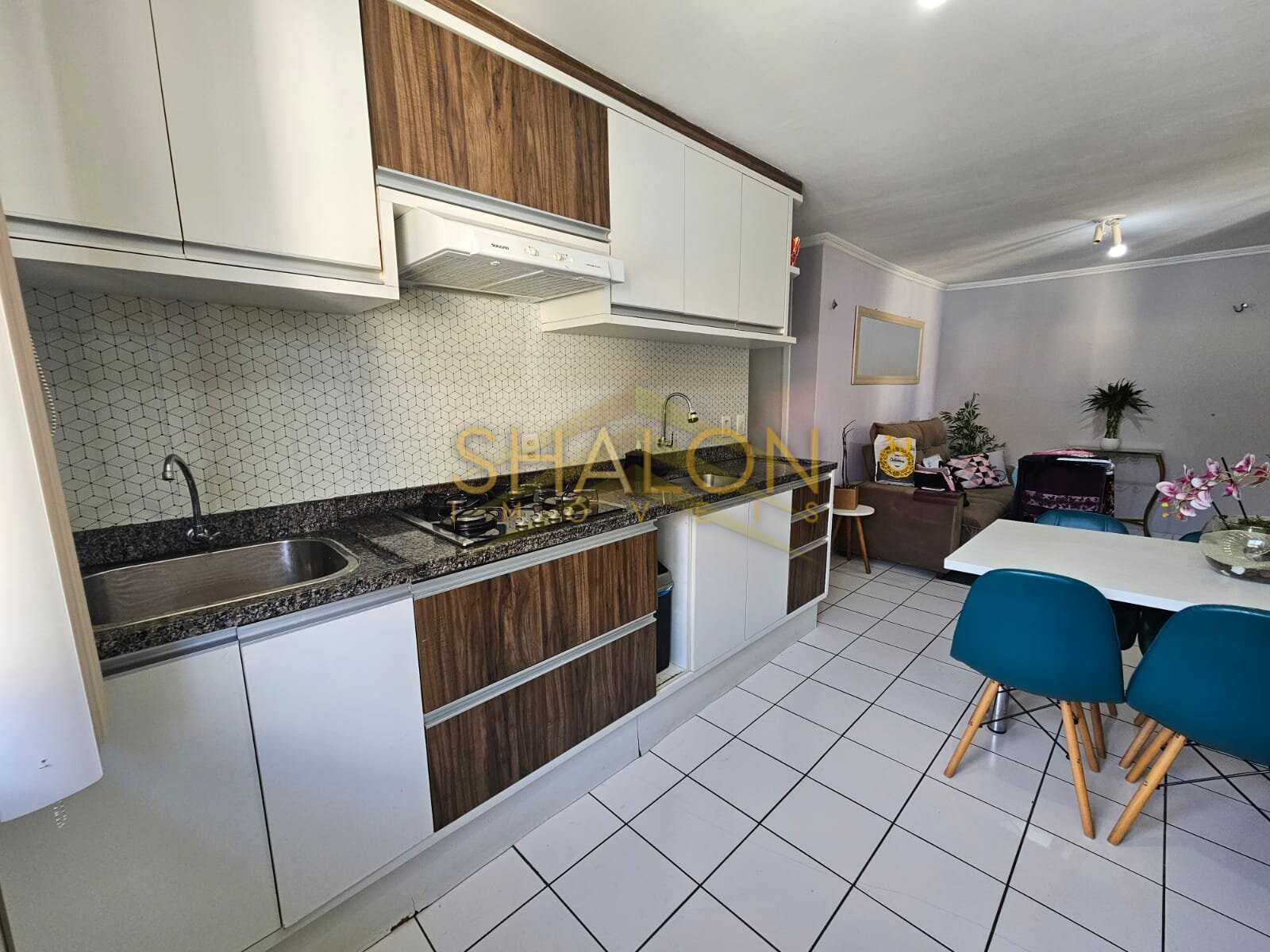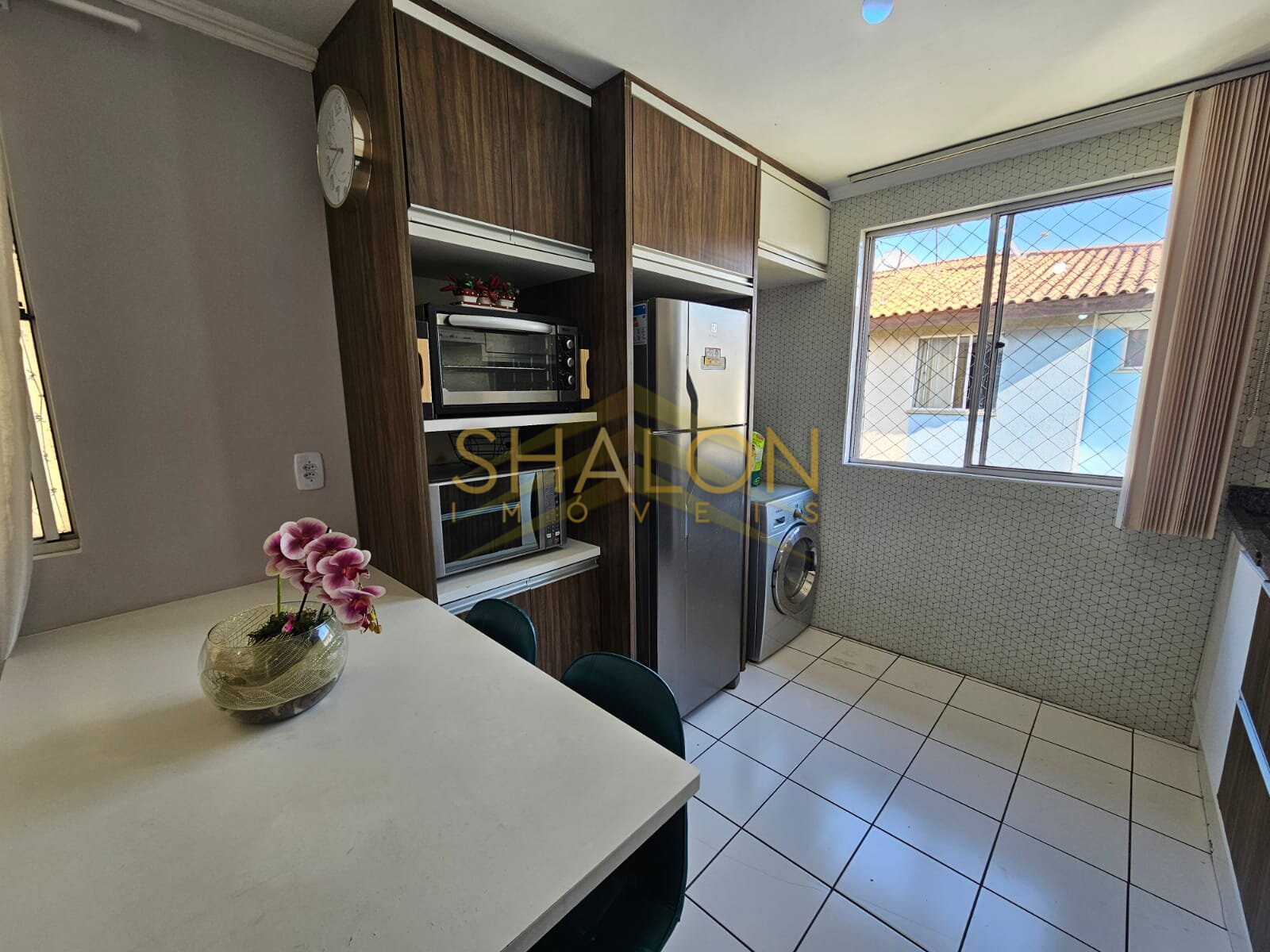 . Cozinha com armários planejados e lavanderia integrada, funcional e organizada
